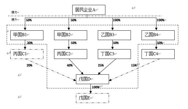 中国居民企业A分别控股了四家公司甲国B1、甲国B2、乙国B3、乙国B4,持股比例分别为50%、50%、100%、100%;B1持有丙国C1公司30%股份,B2持有丙国C2公司50%股份,B3持有丁国C3公司50%股份,B4持有丁国C4公司50%股份;C1、C2、C3、C4分别持有戊国D公司20%、40%、25%、15%股份;D公司持有戊国E公司100%股份。图示如下: