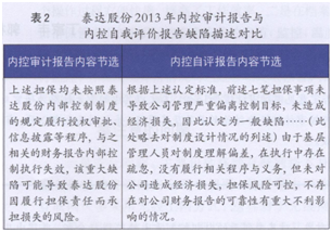 以泰达股份为例,2013年对于“违规担保”这个双方共同确认的事实,审计师和上市公司对其影响进行了分析,给出了不同的认定结论(审计师认为是重大缺陷,上市公司则认为是一般缺陷。具体见表2。