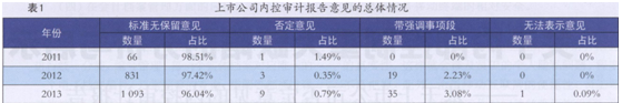 根据有关部门的统计,2011年至2013年我国上市公司内控审计报告的意见总体情况见表1。