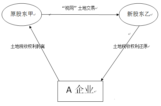 通过上图我们可以看到,首先,A企业持有的土地是被“穿透”、“剥离”到股东甲的层面的,甲乙之间的股权交易在土地增值税征税中被视同为了一项土地的交易,而在交易完成后,这项土地的税收权利应当回到A,而非在新股东层面停留。在征税理论下,我们人为地将土地转了一个圈,似乎才能自圆其说。但是,土地的税收权利必须得回到A,也就是说原股东在转让中实现的增值是作为A的开发成本扣除的。