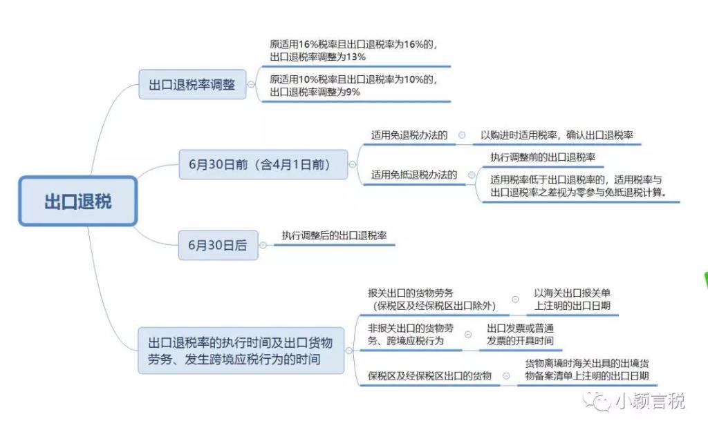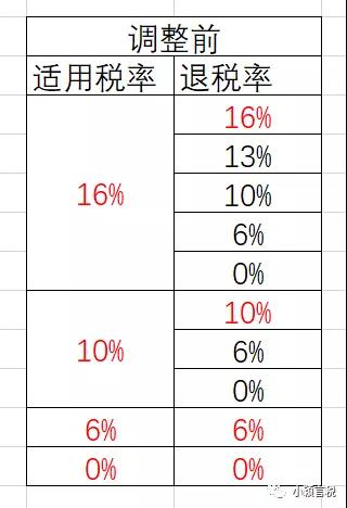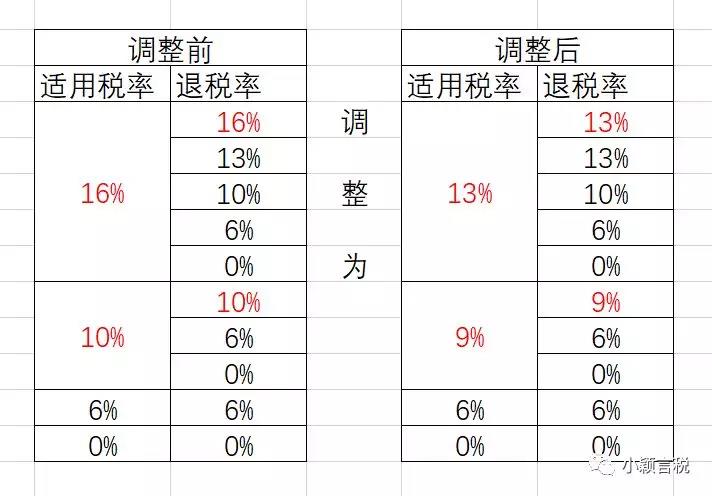 原适用16%税率且出口退税率为16%的出口货物劳务,出口退税率调整为13%;原适用10%税率且出口退税率为10%的出口货物、跨境应税行为,出口退税率调整为9%。