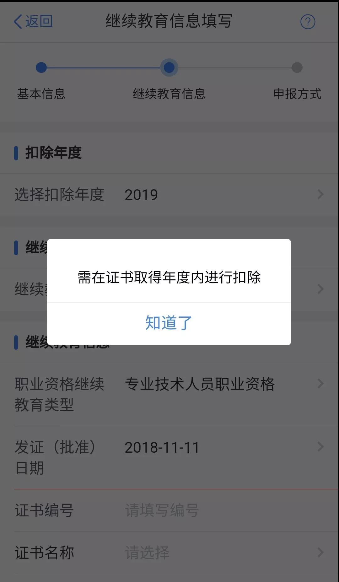 当在个人所得税APP中选择证书的发证(批准)日期为20181111日时,系统会提示需在证书取得年度内进行扣除,即如果按照证书载明的批准日期20181111日进行填报的话,纳税人无法扣除该项继续教育支出。