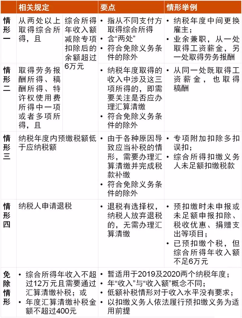 与此同时,以新个税法及实施条例的基本规定为基础,2019年度汇算征求意见稿对于居民个人需要办理汇算清缴的情形进行了细化明确,而94号公告则补充了义务免除情形: