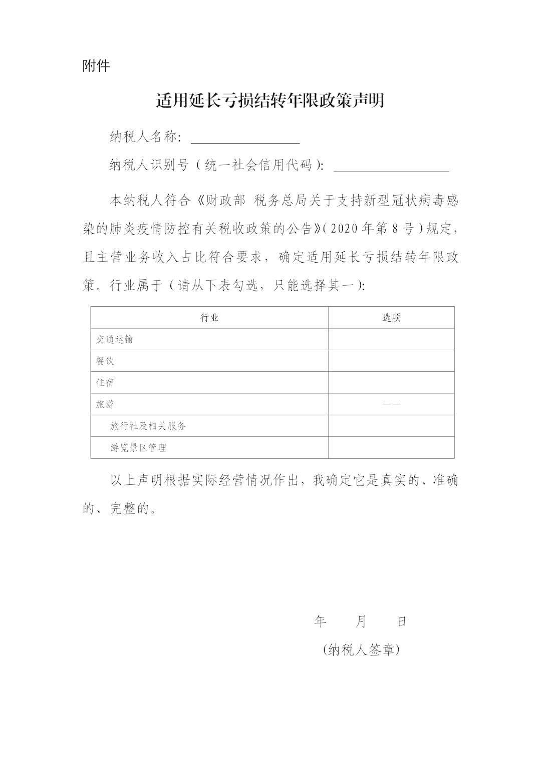 十、受疫情影响较大的困难行业企业按照8号公告第四条规定,适用延长亏损结转年限政策的,应当在2020年度企业所得税汇算清缴时,通过电子税务局提交《适用延长亏损结转年限政策声明》(见附件)。