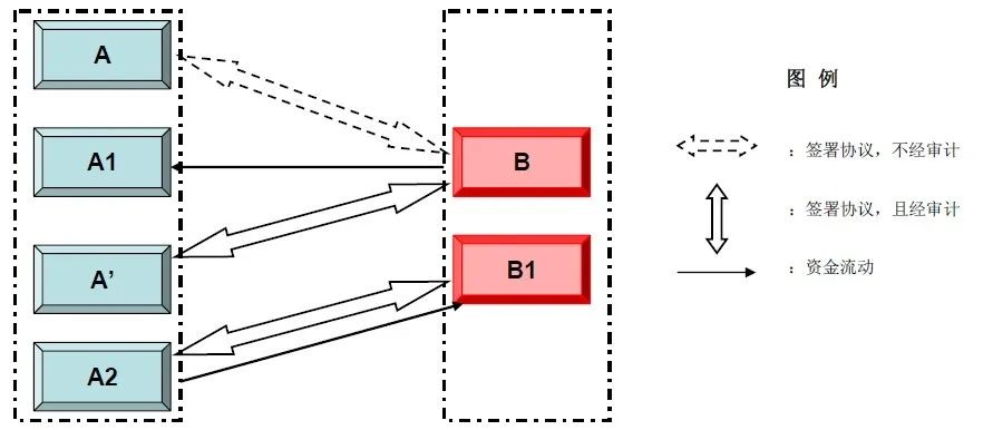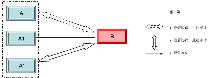 其中B为收购方,A为转让方,A1A的实际控制但没有直接的股权关系,A’为A的合作伙伴