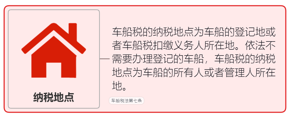 车船税的纳税地点为车船的登记地或者车船税扣缴义务人所在地。依法不需要办理登记的车船,车船税的纳税地点为车船的所有人或者管理人所在地。保险机构代收代缴车船税的,应在保险机构所在地缴纳车船税。