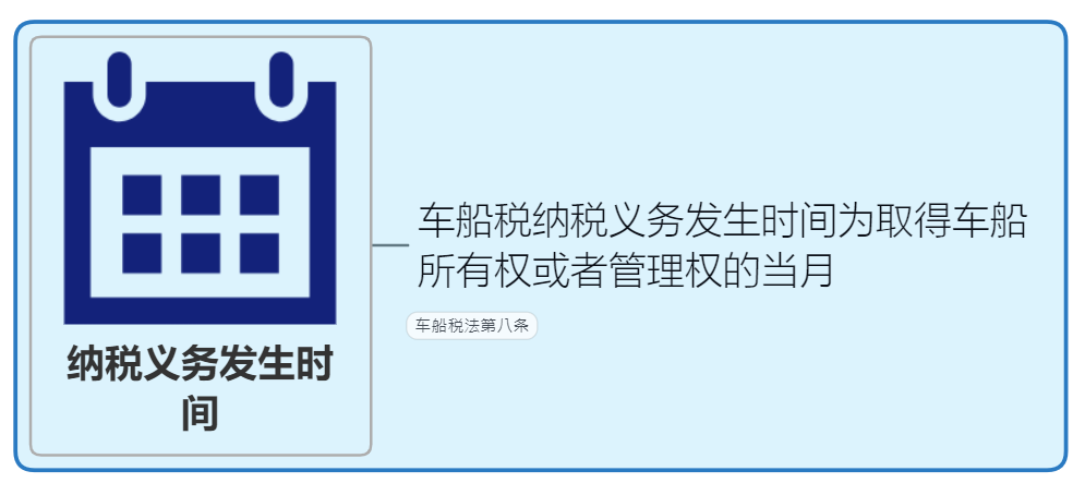 纳税义务发生时间为取得车船所有权或者管理权的当月。车船税实行按年申报,分月计算,一次性缴纳,即一年一交,纳税年度为每年1月1日-12月31日。