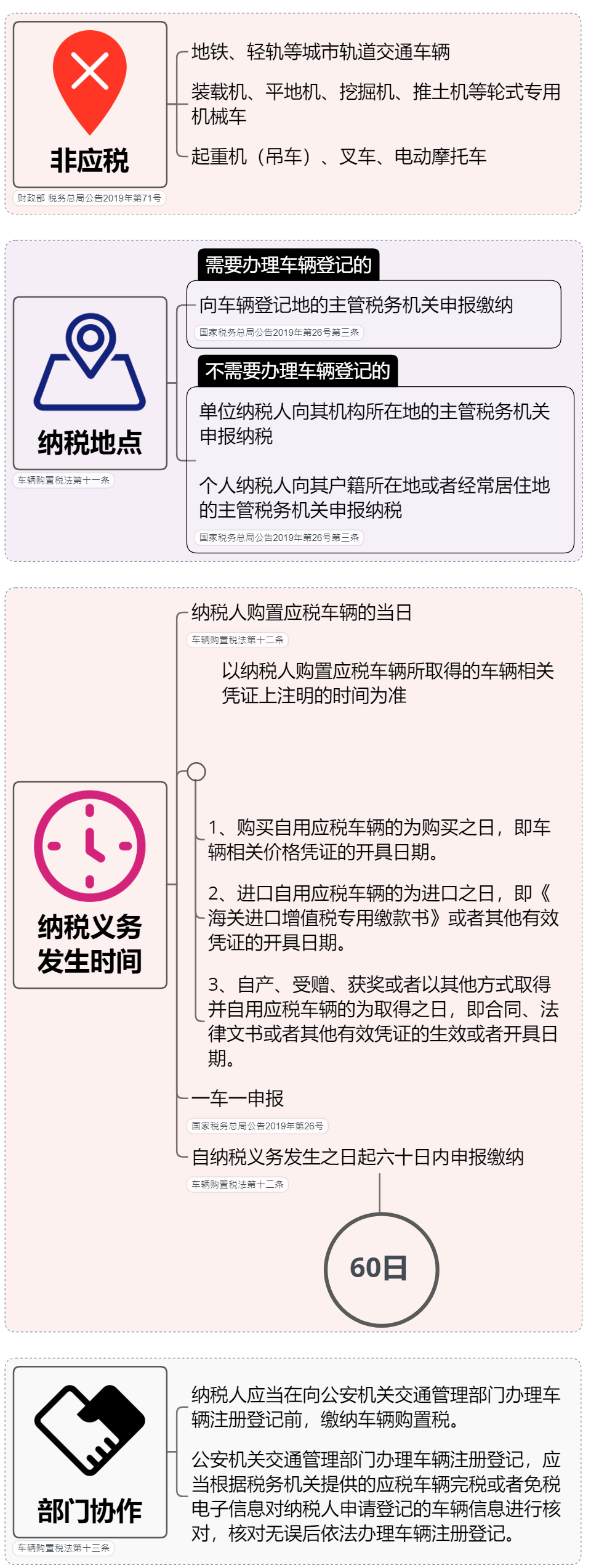 纳税义务发生时间为纳税人购置应税车辆的当日,以纳税人购置应税车辆所取得的车辆相关凭证上注明的时间为准。车辆购置税实行一车一申报制度。