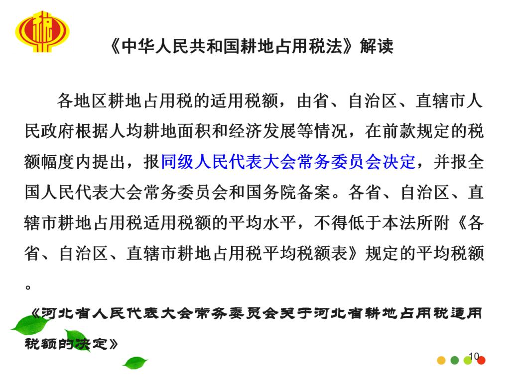 与原条例相比,从量定额的征收方式没有发生改变,授权地方在税法税额幅度内确定具体适用税额的规定没有发生变化。但是调整了适用税额制定权,将具体适用税额决定权由省级人民政府,调整至省级人民代表大会常务委员会决定。《耕地占用税法》将全国所有省份耕地占用税的平均税额分了9档,并附了《各省、自治区、直辖市耕地占用税平均税额表》,规定各地耕地占用税适用税额的平均水平不得低于平均税额表内的税额。同时规定,占用园地、林地、草地、农田水利用地、养殖水面、渔业水域滩涂以及其他农用地建设建筑物、构筑物或者从事非农业建设的,适用税额可以适当低于本地区确定的适用税额,但降低的部分不得超过50%。