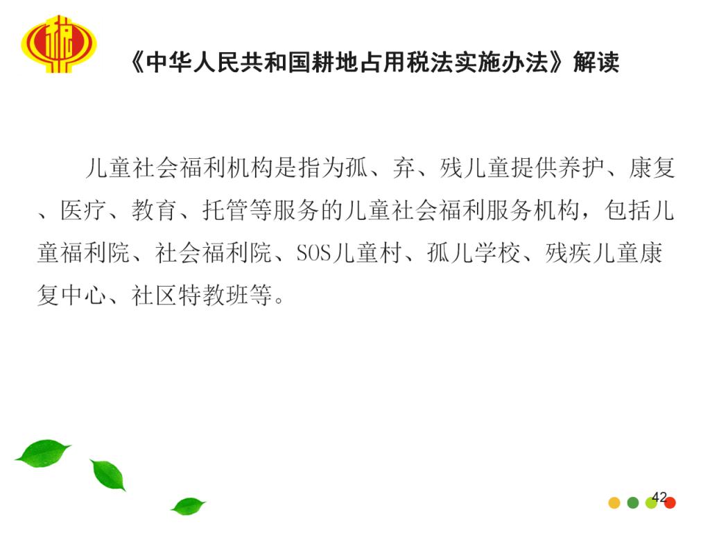 《办法》对具体免税项目作出了定义。对于依法设立的学校、幼儿园、社会福利机构、医疗机构,并不区分公办和私立,不区分国有、民营、外资,一视同仁给予免税待遇。对于公路线路、飞机场跑道、停机坪、港口、水利工程,都强调了依法登记或经批准。需要特别注意的是,学校内经营性场所和教职工住房、医疗机构内职工住房、专用铁路和铁路专用线、专用公路和城区内机动车道占用耕地的,应当按适用税额缴纳耕地占用税。