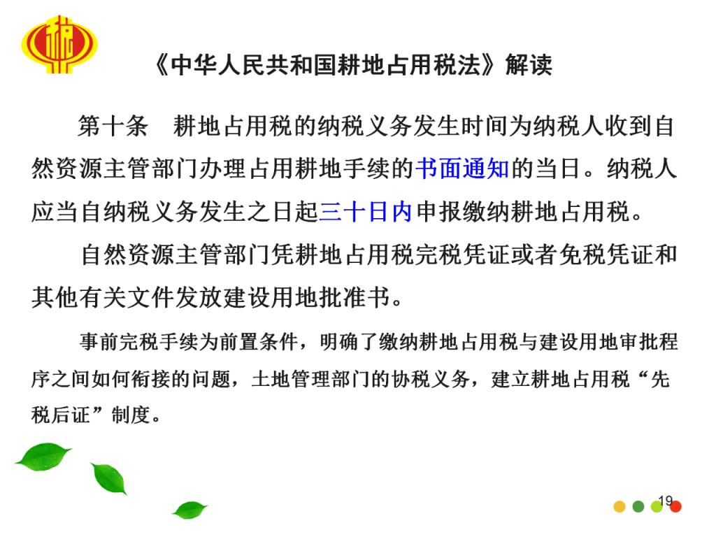 与原条例相比,该法将纳税义务发生时间由“收到土地管理部门的通知之日”修改为“收到自然资源主管部门办理占用耕地手续的书面通知的当日”。此前,在土地管理实践中,“通知”没有统一、固定的形式,为使纳税义务发生时间更具确定性并方便操作,自然资源部配合该法实施增加了书面通知程序。需要注意的是,纳税人应当自纳税义务发生之日起30日内申报缴纳耕地占用税。逾期未申报缴纳的,将依照《中华人民共和国税收征收管理法》等规定追究法律责任。