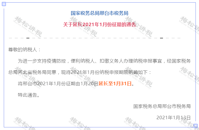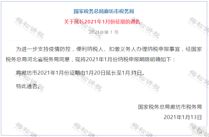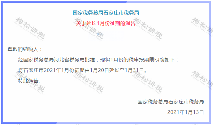 税局紧急通知!由于疫情原因,石家庄、邢台、廊坊等各地,1月份征期由1月20日延长至1月31日!