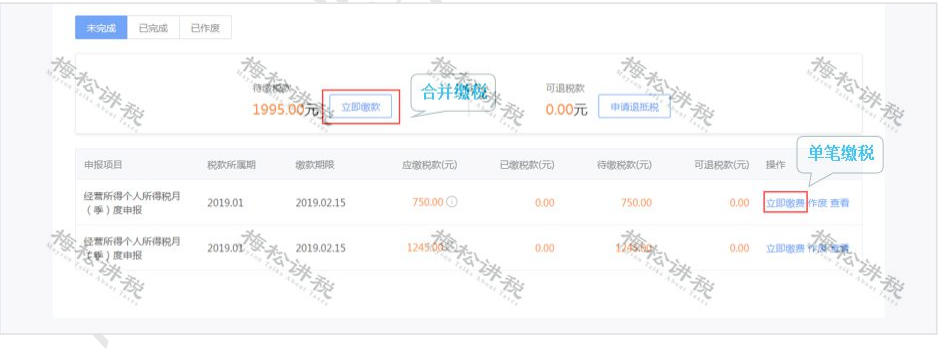点击【我要查询】-【申报查询】-【未完成】,选择对应申报项目进行缴税,如有多条未缴款记录可点击【立即缴税】(仅同一个税款所属机关、收款国库的申报可合并缴税)。