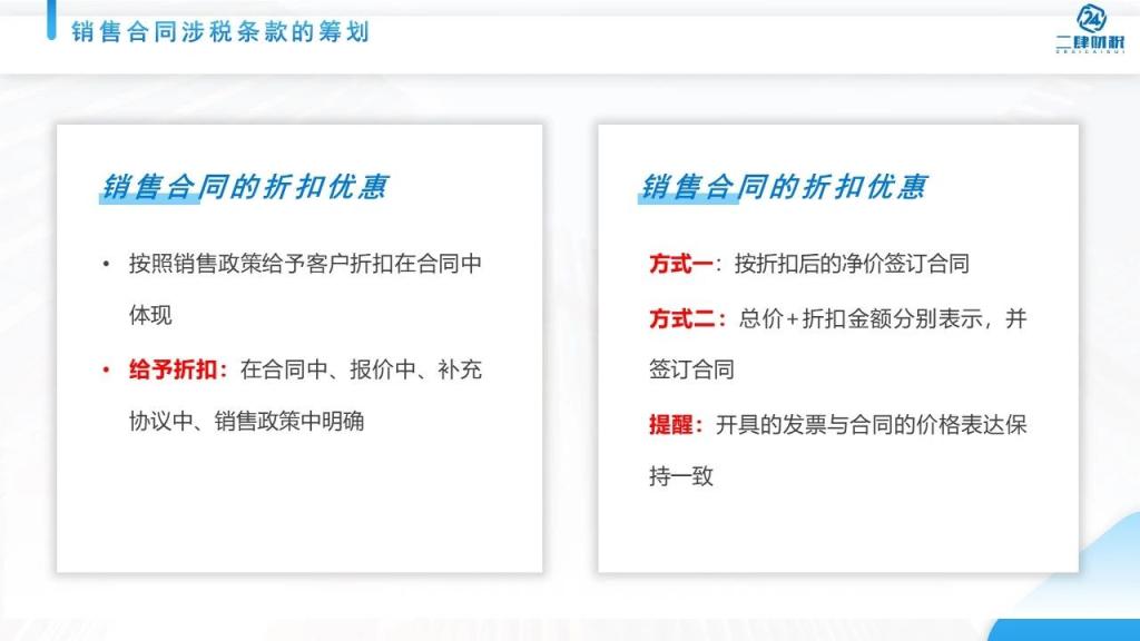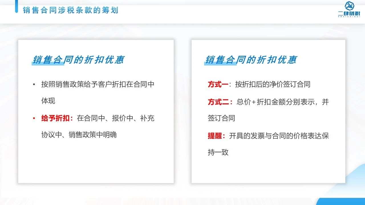 第2种方法,总价是多少?折扣多少,折扣以后是多少,都分别列入到相关的合同当中,或者是报价单当中。这两种表达方式都没有问题,都符合税务的规定。但是我们开票的时候,一定要跟合同表达方式保持一致。这是我们讲的合同当中的价格优惠的问题。