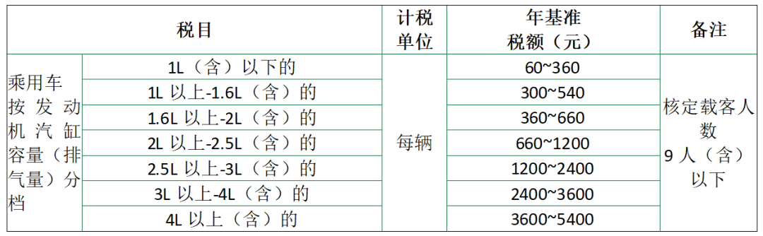 依照《中华人民共和国车船税法》所附《车船税税目税额表》中年基准税额执行。