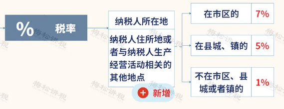 注:纳税人所在地是为了确定城建税具体适用税率,与纳税地点不是一个概念,如海洋油气勘探开发所在地在海上,不属于市区、县城或者镇,适用1%税率,但其纳税地点不在海上。