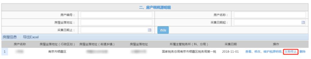 房产税纳税义务终止时,点击“义务终止”,填报房源转出时间,点击“提交”按钮。