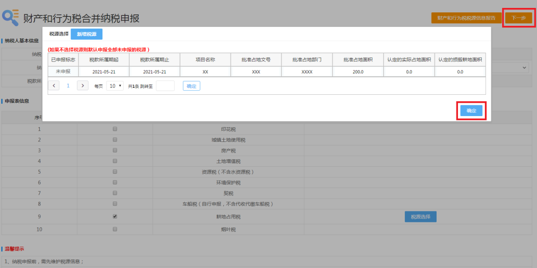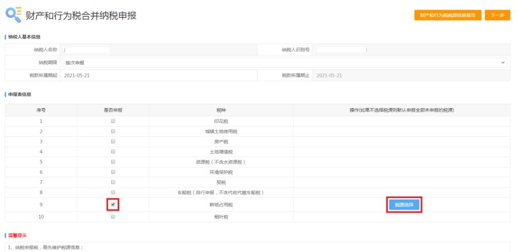2、进入财产和行为税合并纳税申报主界面后,“纳税期限”选择“按次申报”,“税款所属期起”为“收到书面通知日期(或收到经批准改变原占地用途日期)”,勾选耕地占用税,点击税源选择按钮,即会显示当前属期我们已采集的税源,点击下一步按钮,进入申报界面。