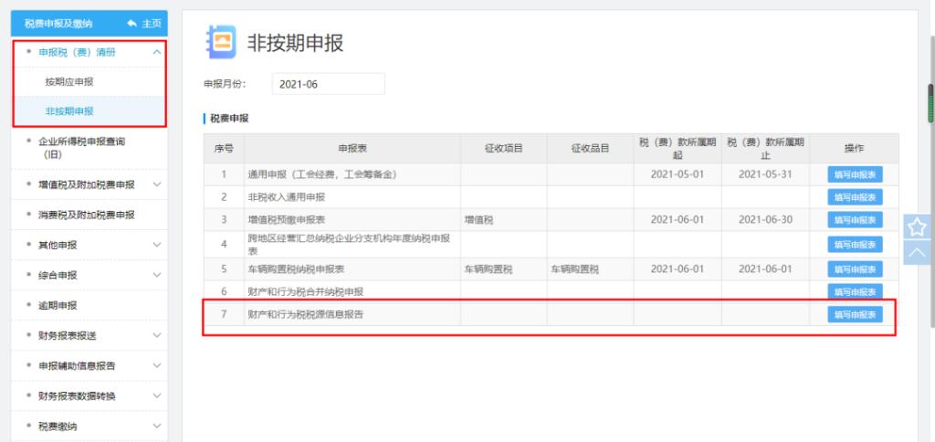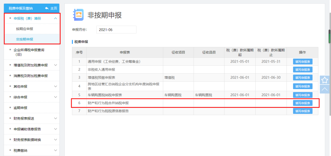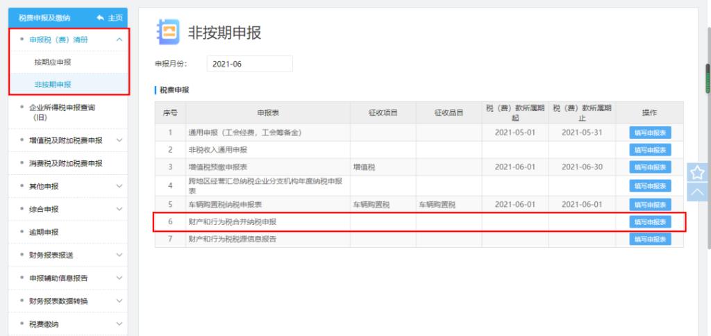 路径2:登录电子税务局 ,依次点击我要办税——税费申报及缴纳——非按期申报——财产和行为税合并纳税申报