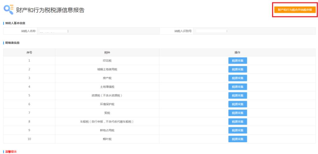 路径1:进入财产和行为税税源信息报告表后,点击右上角财产和行为税合并纳税申报。