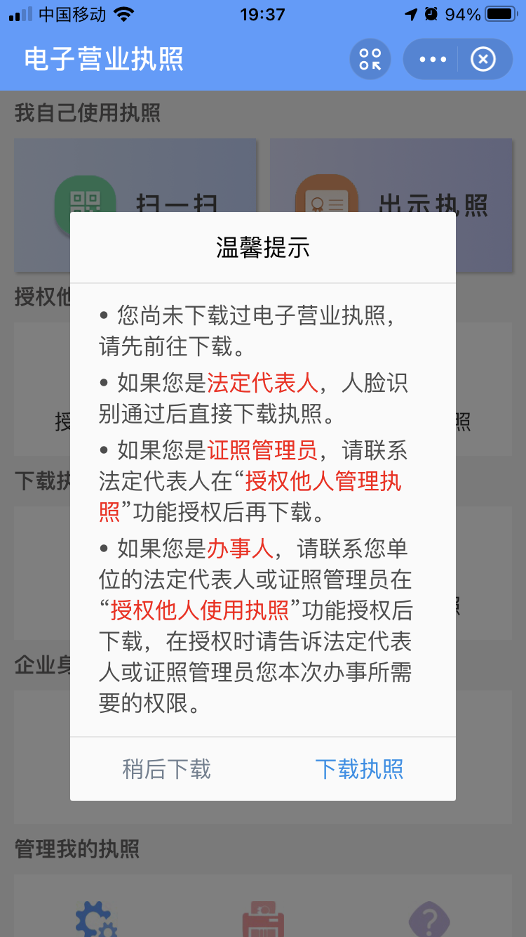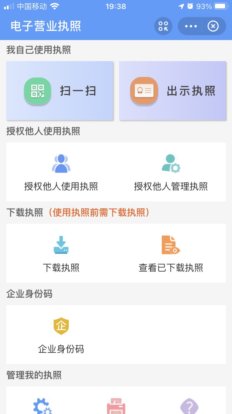 (一)打开手机上的“微信”或者“支付宝”APP,小程序搜索“电子营业执照”。