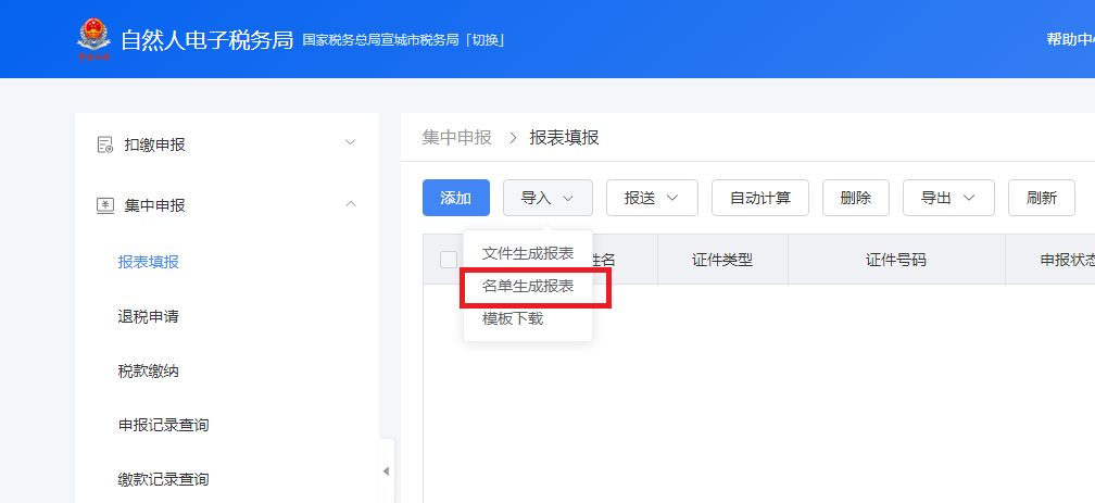 2. 文件生成报表:通过填写导入申报表模板的方式生成。