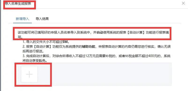 2、导入模板。点击【导入】按钮,选择“名单生成报表”,弹出导入框,点击左下角的“+”,将申报表导入系统。