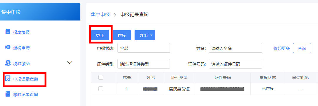 申报完成后可以在【申报记录查询】菜单下查看已完成的申报记录,也可以进行更正或作废。