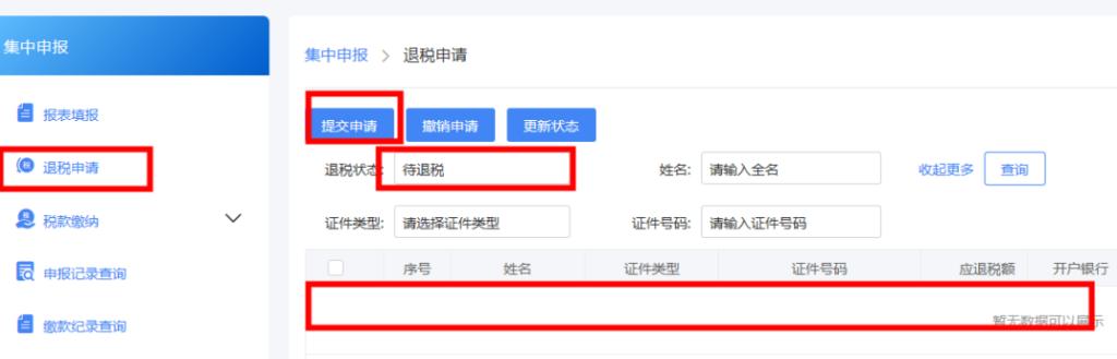 1、点击左侧【退税申请】菜单,进入页面后选择退税状态为“待退税”,点击查询,将符合退税条件的纳税人展示在列表中,勾选单个纳税人或者批量勾选后,点击的【提交申请】按钮。