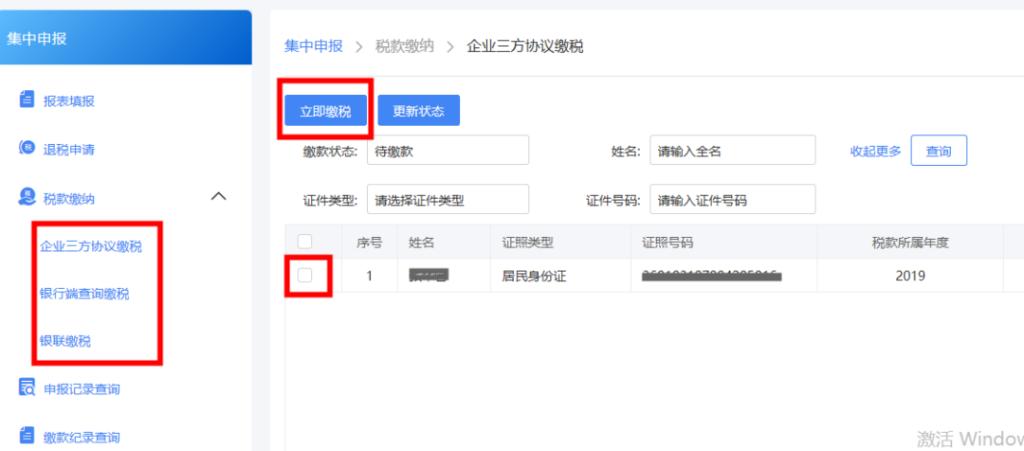 点击左侧【税款缴纳】菜单,选择缴款方式,进入页面后系统自动获取未缴纳税款的纳税人信息,勾选单个纳税人或者批量勾选后,点击上方的【立即缴税】按钮。