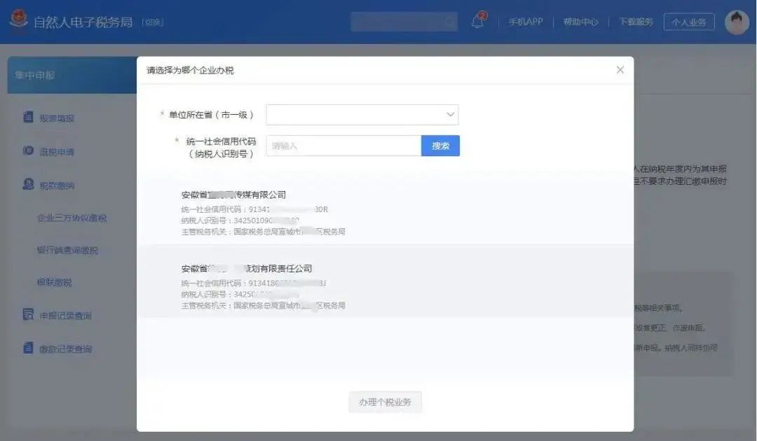 2、登录后,点击【单位办税】,选择要办理集中申报的企业,进入集中申报业务办理页面。