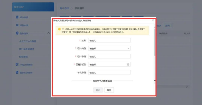 2、添加的人员都必须符合集中申报条件(纳税年度内申报过正常工资薪金所得、外籍人员正常工资薪金所得、劳务报酬所得(保险营销员、证券经纪人)),否则阻断申报。