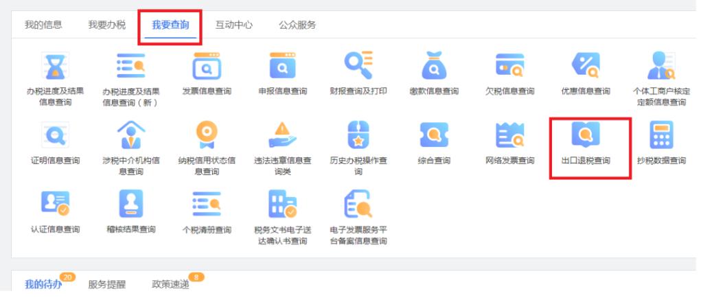 第一步,登录厦门市电子税务局,点击【我要查询】-【出口退税查询】。
