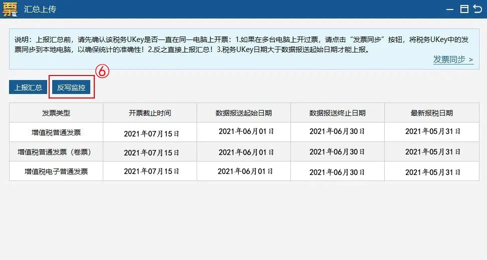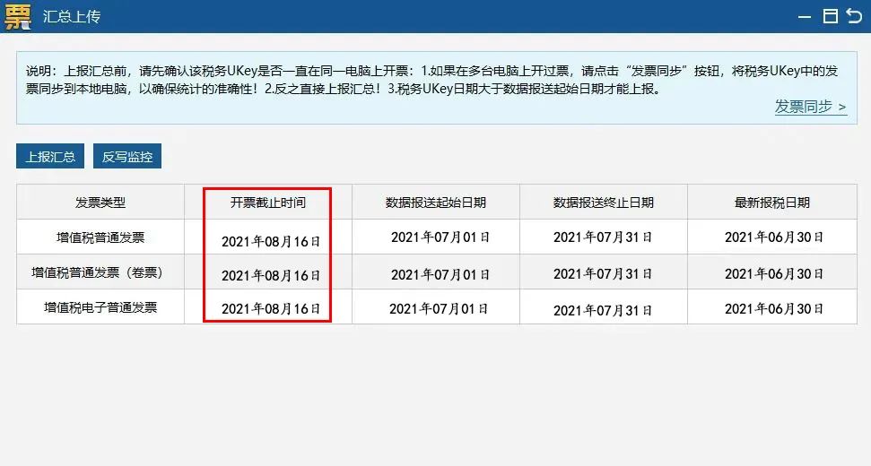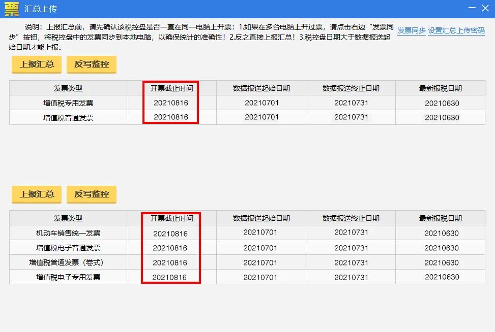 操作流程:重新打开汇总上传界面,查看各发票类型开票截止时间是否更新到下月中旬,若更新,说明操作成功。