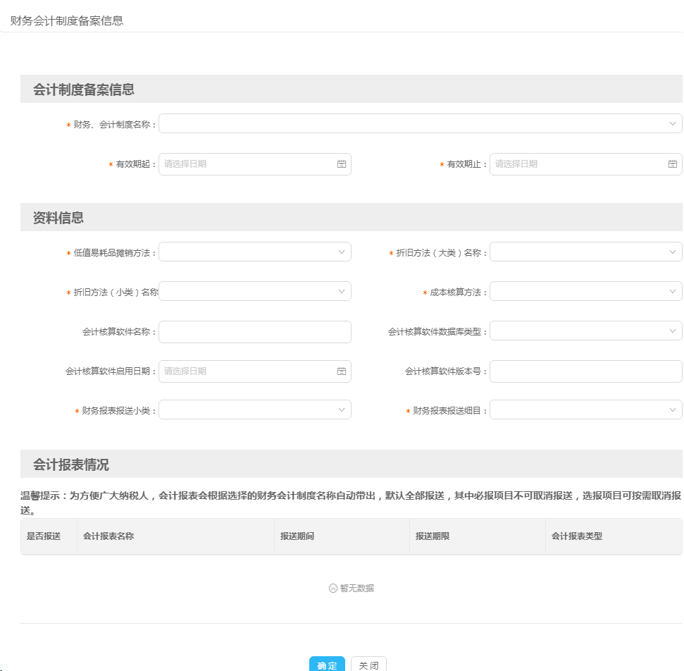 打开财务会计制度备案及变更功能页面后,如果没有会计制度备案信息可以点击[增加]按钮进行添加财务会计制度备案信息。