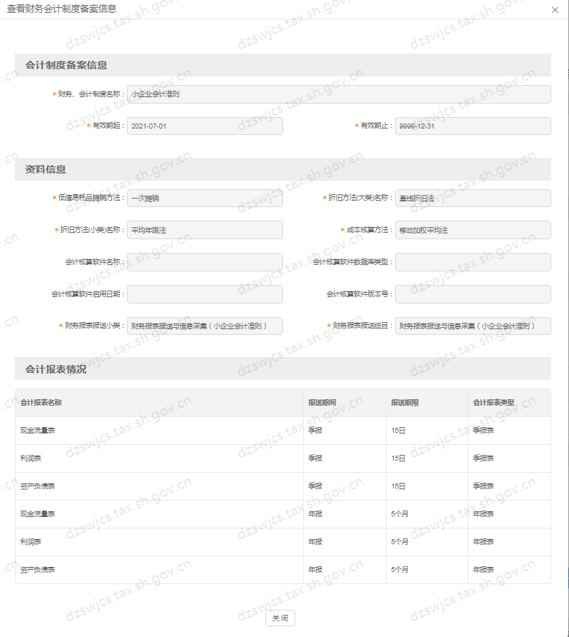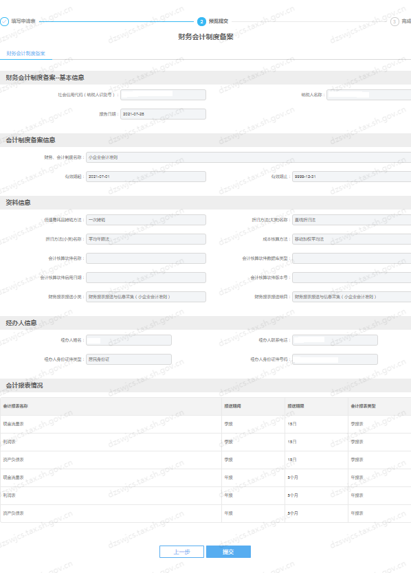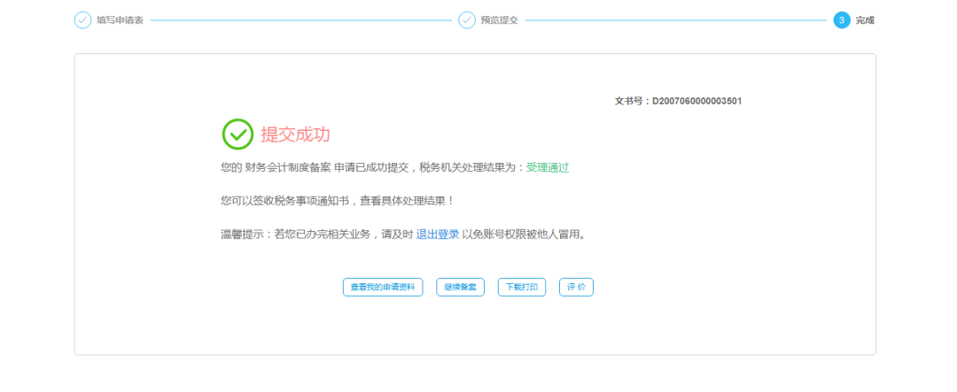 点击【提交】,提交后可点击【查看我的申请资料】按钮查看申请资料,点击【下载打印】按钮可下载《财务会计制度及核算软件备案报告书》和《税务事项通知书》。