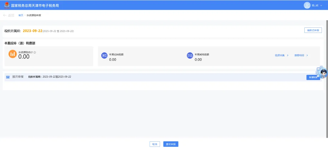 登录新电子税局后,点击【我要办税】-【税费申报及缴纳】-【水资源税申报】功能菜单。