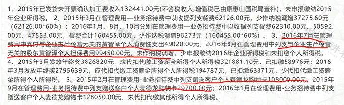 2、2015年2月在管理费用-业务招待费中列支赠送客户个人的购物卡108000.00元,2015年9月在管理费用-业务招待费中列支赠送客户个人的购物卡29700.00元;2016年1月在管理费用-业务招待费中列支赠送客户个人的购物卡128050.00元,未代扣代缴其他所得个人所得税。