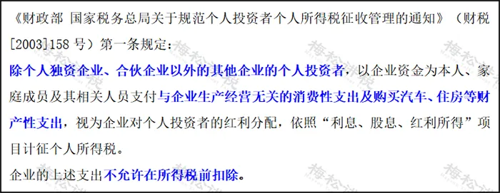 除个人独资企业、合伙企业以外的其他企业的个人投资者,以企业资金为本人、家庭成员及其相关人员支付与企业生产经营无关的消费性支出及购买汽车、住房等财产性支出,视为企业对个人投资者的红利分配,依照“利息、股息、红利所得”项目计征个人所得税。