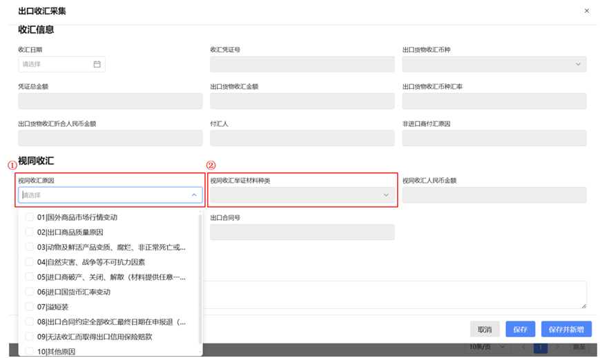 在出口货物收汇情况表页面点击【视同收汇原因】,再选择【视同收汇举证材料种类】,信息录入完成后点击【保存】。