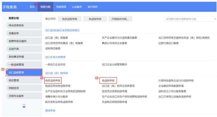 1.登录新电子税局,点击【我要办税—出口退税管理—免抵退税申报】(生产企业)或者【我要办税—出口退税管理—免退税申报】(外贸企业)。