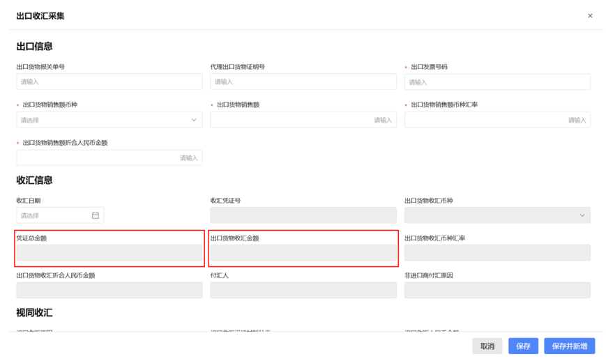 (3)多张报关单对应一张收汇凭证:需拆分申报,凭证总金额需录入该笔银行收款凭证的总收款金额,出口收汇金额需录入对应出口明细的收汇金额。