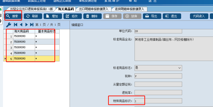 2、进行搜索代码查询,查询出来后,如果标识是1,这就是代表征税。
