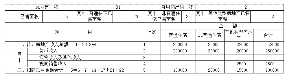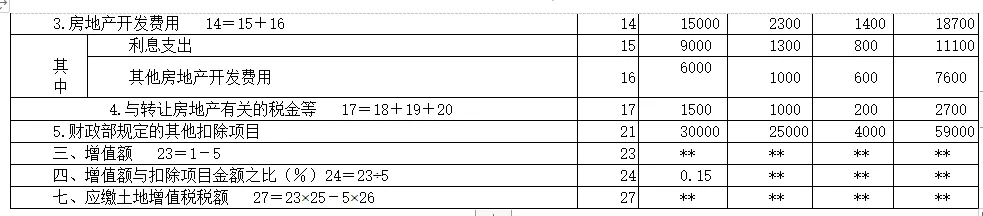 3. 24行增值额与扣除项目金额之比是检查的关注重点,普通住宅的增值率0.15小于0.2,意味着企业享受免税的税收待遇,重点关于有无隐瞒收入和虚增成本的情况。