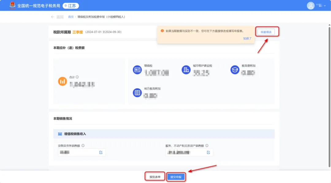 如需修改其他数据,点击右上方【我要填表】即可切换到填表式申报模式,纳税人可根据实际经营情况对数据进行修改。修改完成后,可以点击【预览表单】检查报表数据。