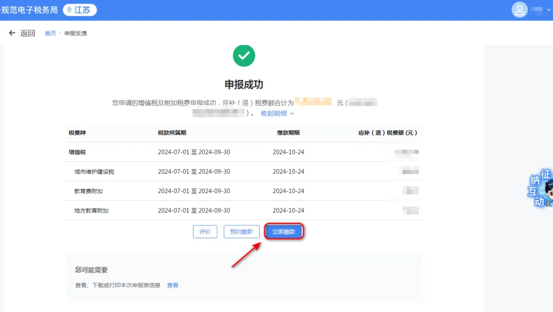 申报成功后,可看到本期税款,查验金额无误后,点击【立即缴款】完成本次申报涉及的税费款缴纳。