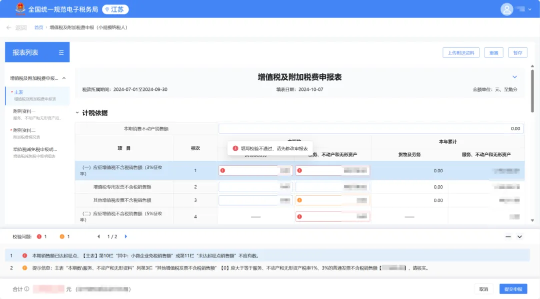 若系统出现“填写校验不通过,请先修改申报表”提示,请根据左下角提示正确修改表单内容。其中橙色为提示类问题,可以在确认无误情况下进行提交;红色为强制类问题,纳税人必须在正确修改表单内容后方可提交。