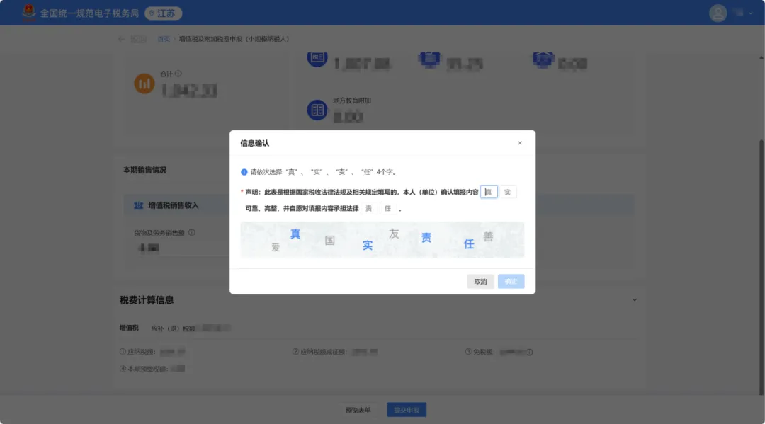 确认数据无误后,点击【提交申报】。纳税人需要对本次申报的结果进行信息确认,按照提示依次点击“真”“实”“责”“任”补全声明信息后,点击【确定】即可提交申报。