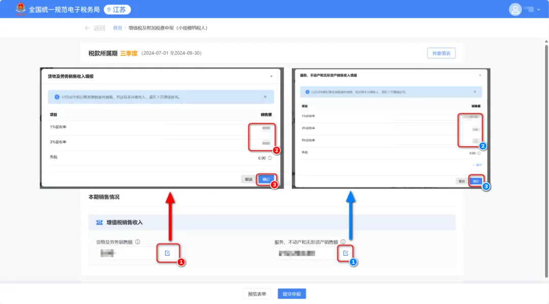 如因存在未开票收入导致销售收入与实际经营不符,应根据收入的性质点击【货物及劳务销售额】、【服务、不动产和无形资产销售额】输入框,根据实际经营情况编辑完成后,点击【确定】即可。