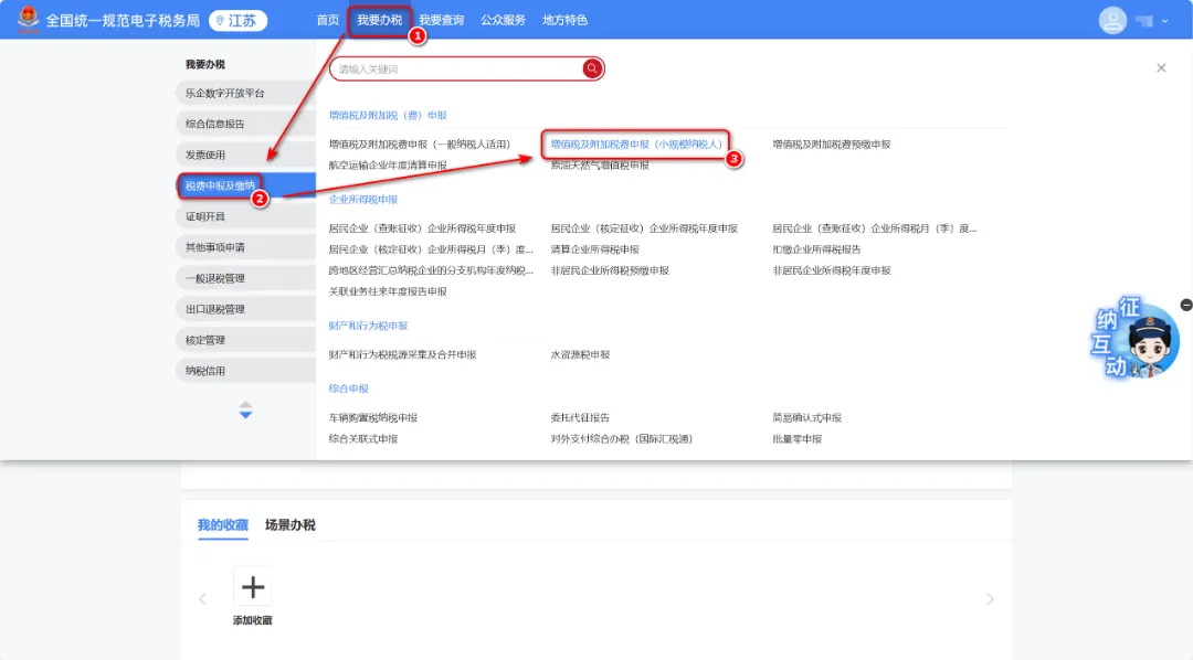 您也可点击【我要办税】-【税费申报及缴纳】-【增值税及附加税费申报(小规模纳税人)】,或搜索“增值税及附加税费申报(小规模纳税人)”进入申报。